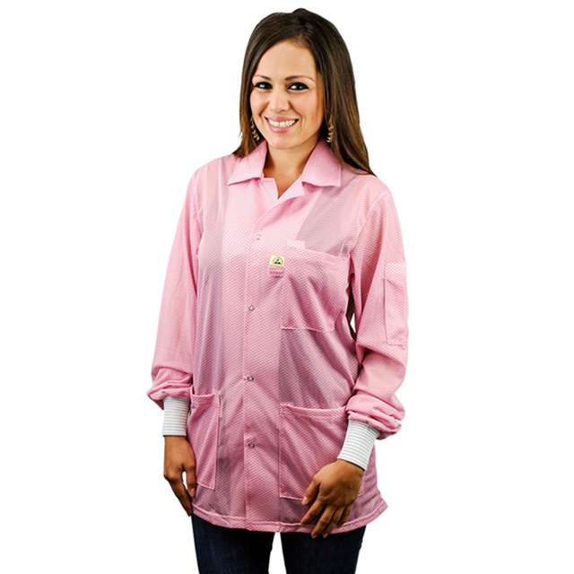 nákvæm lýsing Polyester Smock, Jacket Length with Cuffs Medium Pink 4mm Snap Stud on Hip, Badge Tab, Pockets, Static Dissipative Litur Pink