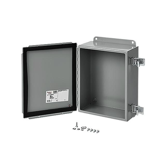nákvæm lýsing Junction Box Metal, Steel Gray Hinged Door, Lid 7.992" L x 5.984" W (203.00mm x 152.00mm) X 3.504" (89.00mm) Hönnun Hinged Door, Lid